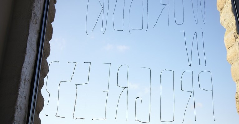 The next surprise came shortly afterwards when she attempted to de-compress the drawing again, only to find that it re-emerged as a completely different, rectilinear pattern. The baroque serpentine drawing had been transformed into a strict geometrical set of lines, through the action of the computer processor. There was no going back. For Tuerlinckx, however, this strange revelation was a “wonderful discovery … that baroque and minimal[ism] touch each other”[3], an idea which became the basis for the ensuing series of works. Typically, the artist’s response to the corruption of her drawing by the computer system was to adapt her own methodology accordingly. As with the serial adaption of the title of her current exhibition, transiting from ‘work’ to ‘world’ to ‘word’, her method is constantly to be ‘in progress’, and so to remain open in, what Catherine Wood has described as, “a kind of continuous perceptual present where manifold possibilities of meaning proliferate.”[4] By responding, step-by-step, in real-time, to the formal disciplines and constraints of language – or to the formal conventions of the art institution, in real-space – Tuerlinckx nimbly manages to evade the regulation of reductive equivalence.