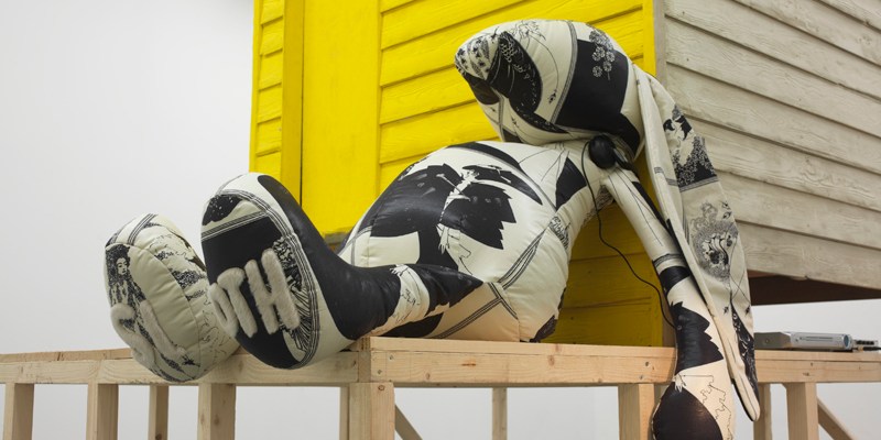 Paradoxically, in Bone Idle for Arnolfini’s Sloth Section, Loop #2 of the Lazy Susan Series, the outcome of the artist’s vita contempliva is a kind of sweatshop of intensive over-production. An art warehouse packed to the rafters with over-sized soft toys; stuffed cartoon animals, grown fat, fluffy and fatigued, hanging from hooks, sat astride mock missiles or slumped across makeshift plinths, surrounded by the paraphernalia of the leisure industry: beach huts, sun-shades and parasols. Goggle-eyed “Fruits de Mer,” with imploring, anthropomorphic features, are scattered about the place, like lost extras from The Little Mermaid. A giant silken octopus, clams, crabs; the molluscs’ hard, protective shells re-produced in soft and vulnerable flannel, and an array of alluring colours. Central to this episode of the Lazy Susan Series is a clapped out stuffed rabbit with big floppy ears, all black, flat on its back on a mechanized rotating disk (or Lazy Susan), lazing under a placard that declares, “Art is not a natural science,” listening to a dub techno soundtrack of Moritz von Oswald. On the soles of its fabric feet, in homage to the Button Donkey,4 are stitched the letters SL and OTH.