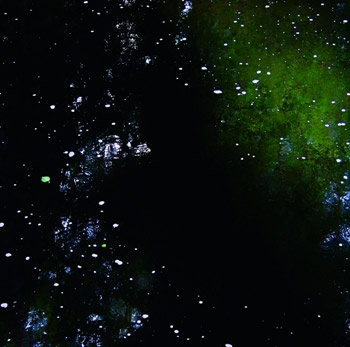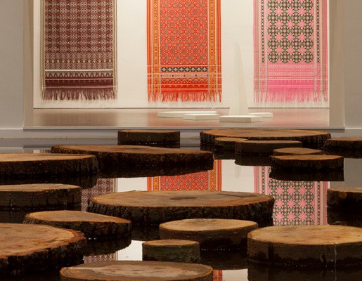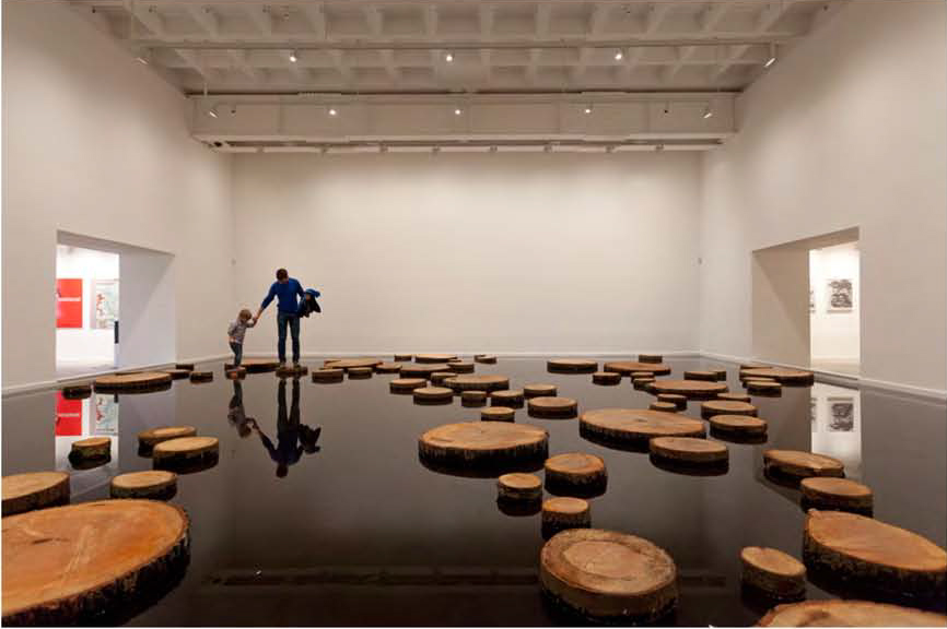 Another of Braun’s project that focuses on Indian Modernism is the large-scale installation R.T./S.R./V.S. (2003 ongoing), taking its inspiration from an unrealized film by the renowned Bengali filmmaker, Satyajit Ray, entitled The Alien. Ray’s script, written in1967, tells the story of an extra-terrestrial being who crash lands into a lotus pond close to a remote Bengali village. The mischievous alien plays a series of pranks on the villagers, which are seen as miracles, and the community begins worshipping his spacecraft as a temple risen from the depths of the earth. As the alien causes confusion in the small village, the script points towards the conflicts that occur when change is imposed on a traditional way of life. While Ray’s film was eventually abandoned after negotiations with Hollywood producers broke down, despite Marlon Brando and Peter Sellers having been signed up for leading roles, the script for the film has been said to have been used as the inspiration for Steven Spielberg’s classic feature, E.T. The dark shimmering lake, which forms Braun’s installation, recreates the opening scene of the unrealized script, when the golden antenna of the spacecraft emerges from the pond. In the gallery, the lake can be crossed via a meandering path of wooden logs, in place of lotus leaves, inviting the audience to become part of the scene.