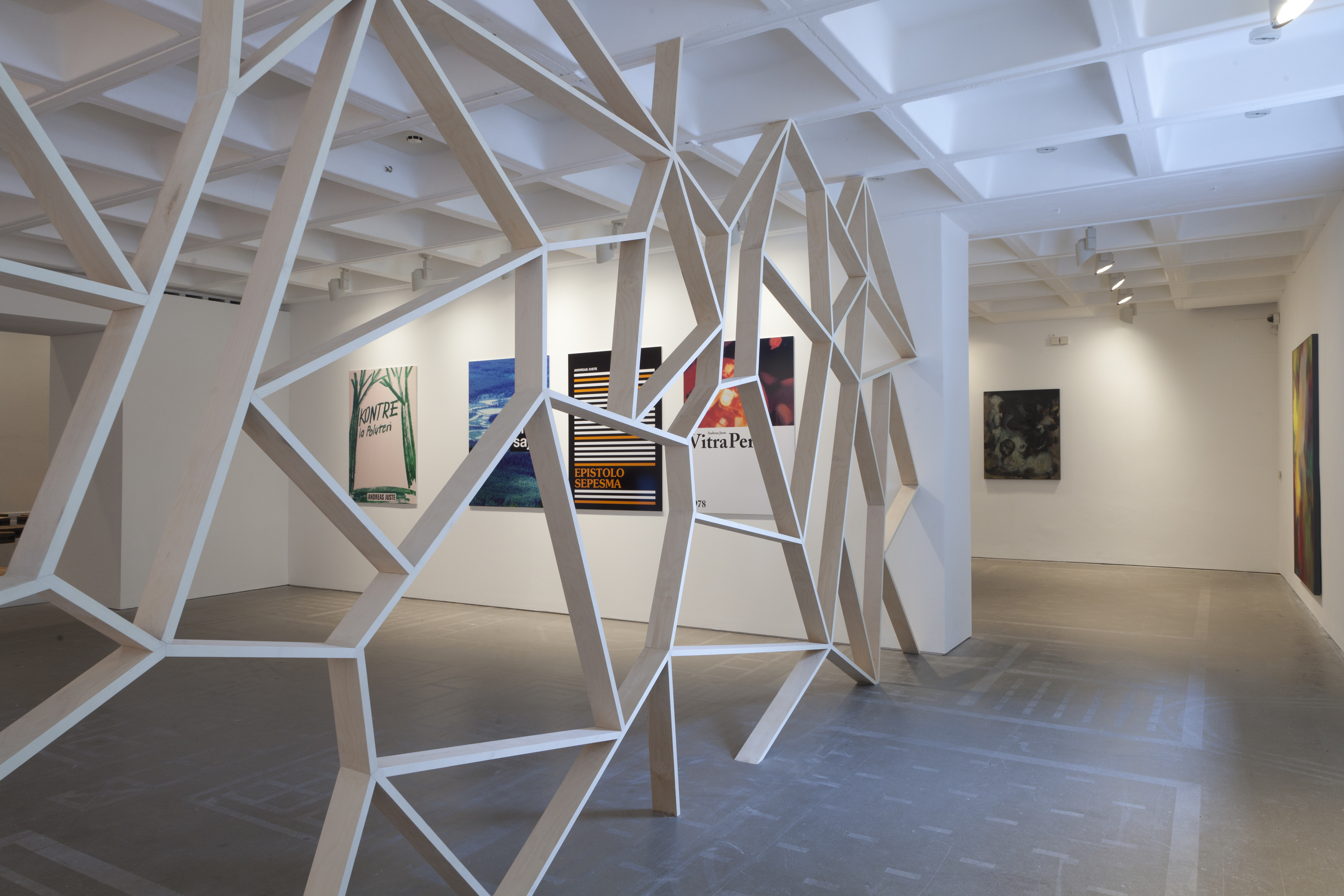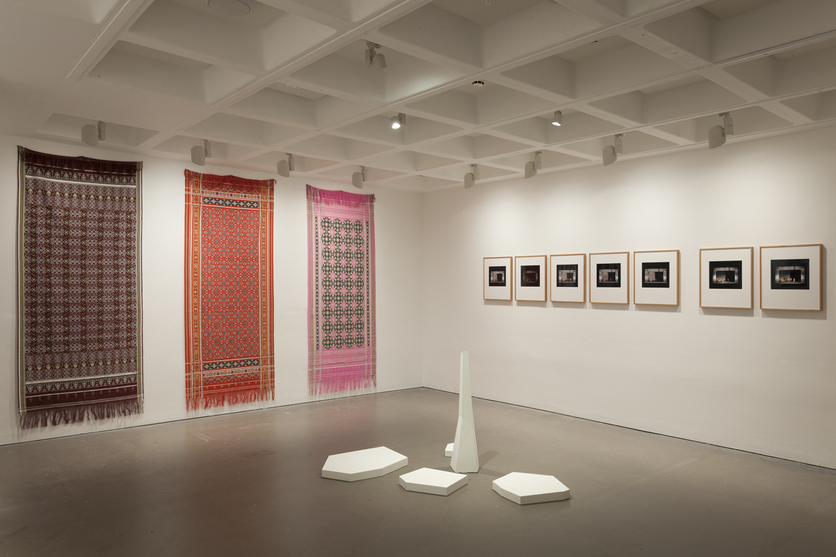 Central to Braun’s practice is a particular approach to referencing. Certain images, objects or names are deliberately cited, as part of his associative methodology, but it is left open to the viewer to trace conceptual relationships between the different elements of the exhibition. They can be read as purely formal arrangements of artefacts, or as glimpses of an extensive rhizomatic network of ideas and cultural practices. For example, Braun has long been interested in Indian culture and its relationship to Modernity, and a specific artefact that has held his interest is the ‘patola’, a brightly coloured woven silk saree originating in Gujarat. As valuable objects, patolas travelled through international trading routes from the 12th century onwards. Many patolas now in Western textile collections are actually replicas of these rare originals, but this did not matter as they maintained their exchange value, circulating internationally as a form of currency. Braun’s copies, which make no attempt to disguise the fact that they are prints, play on the productivity of the relationship between tradition and modernisation, the local and the global, by allowing the effects of appropriation to take some formal control of the work. Whether we view these artefacts, in the context of the gallery, as isolated aesthetic objects or as metonyms for intercultural exchange is open.