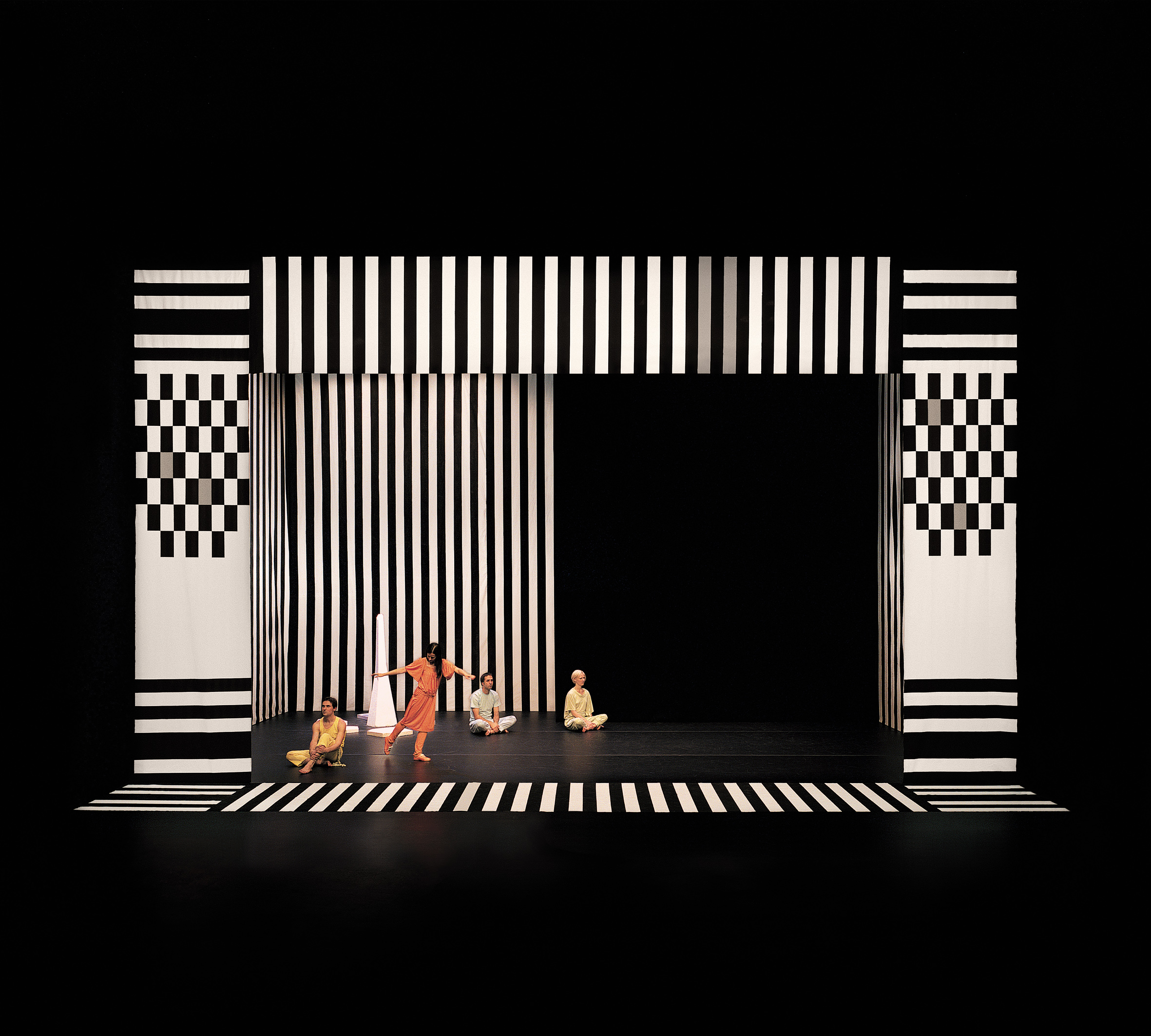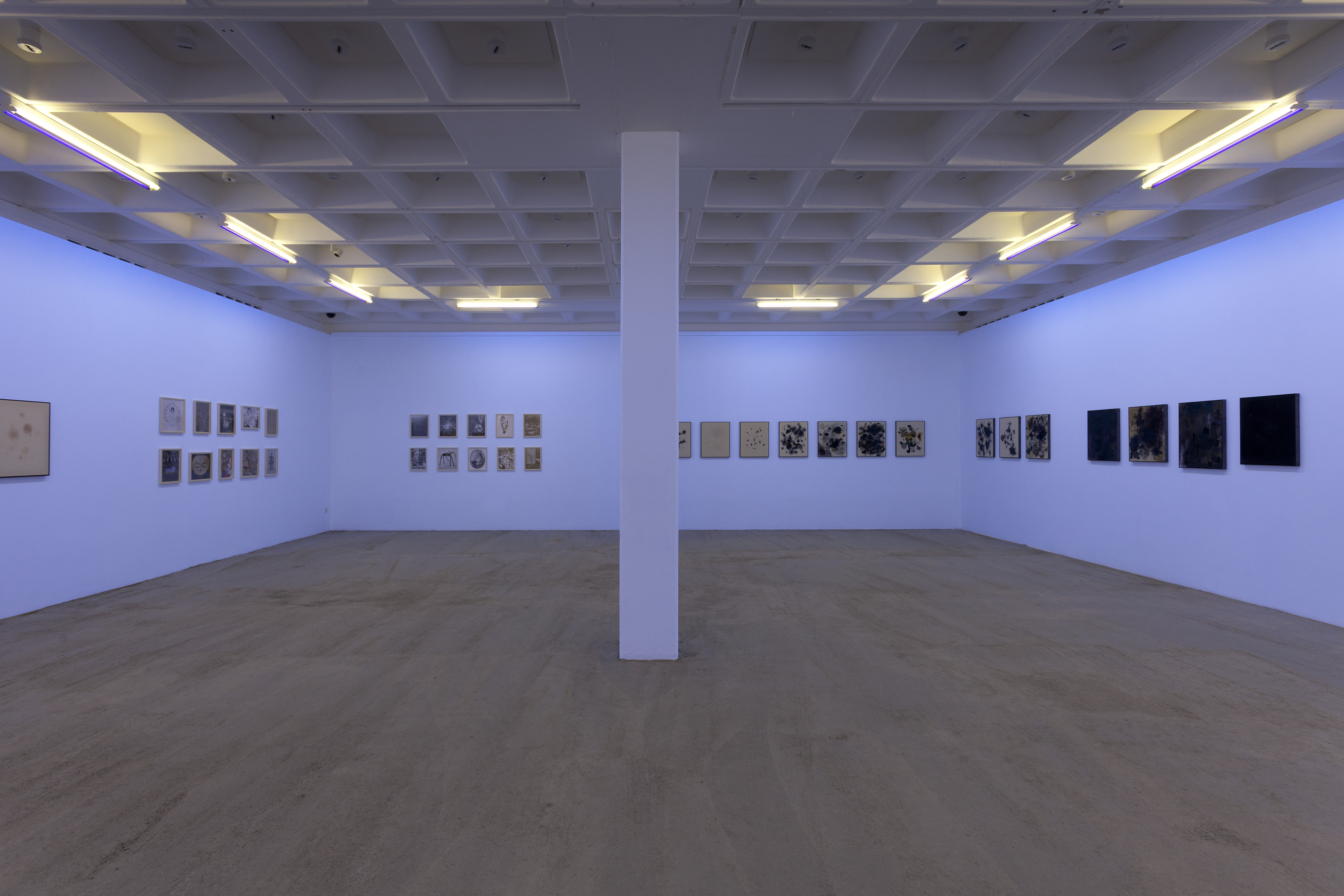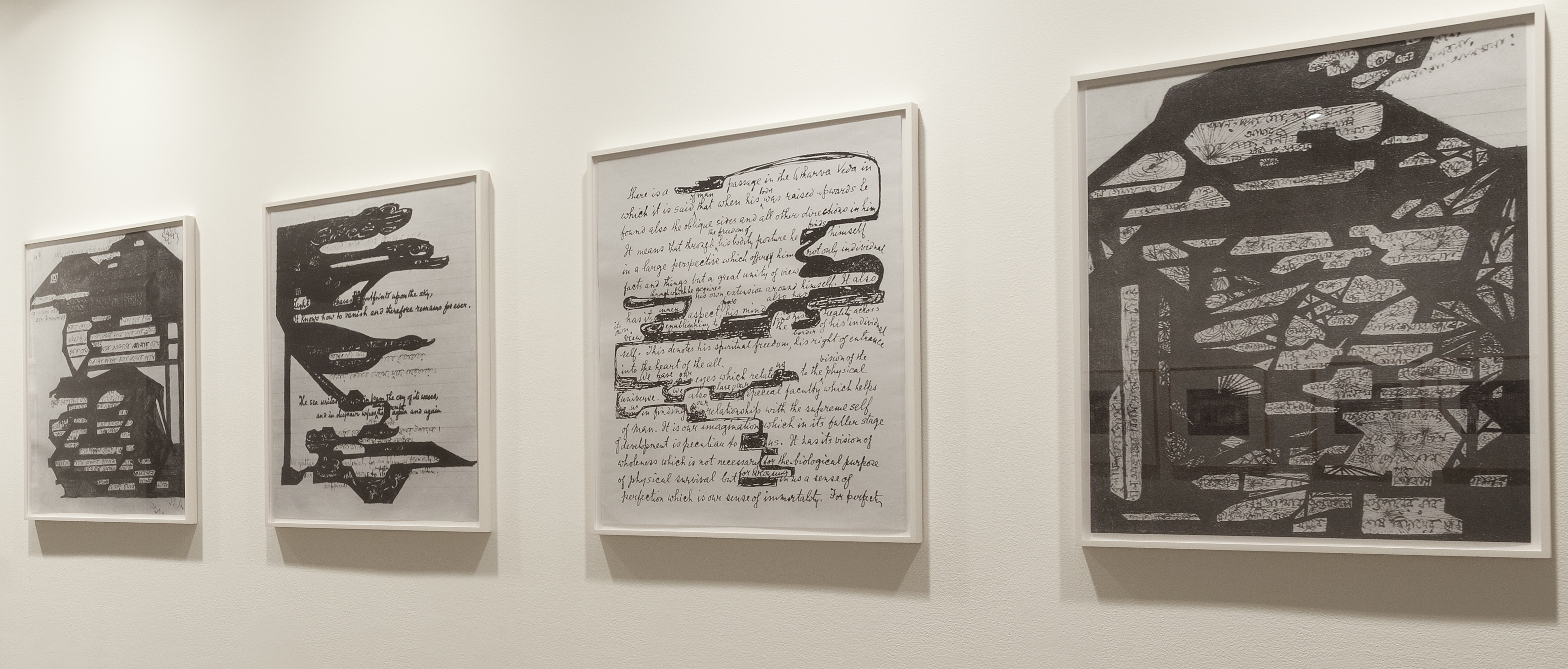 The title of the installation, R.T./S.R./V.S.,refers, besides Satyajit Ray (S.R.), to the Bengali poet and polymath Rabindranath Tagore (R.T.), who was the first non-European to win the Nobel Prize for Literature in 1913, and to Vikram Sarabhai (V.S.), a physicist and founder of the Indian Space Research Organisation. Thus Braun cites three of the most prominent figures of early Modern India in relation to the work. Two series of prints are also dedicated to Rabindranath Tagore and Vikram Sarabhai, respectively, marking their involvement in educational projects: Tagore founded a reform school in Santiniketan in 1901, which later became a university (and the model for Dartington, in the UK), and Sarabhai’s family, who owned several textile mills, founded the Calico Museum, for which the American modernist designers Ray and Charles Eames developed a part of the display. One of the print series shows early manuscript pages by Tagore, whose graphic additions anticipate his later preoccupation with painting. The other series contains photographs of the Sarabhai family, a memorial for him and the satellite that marked India’s departure into space.
