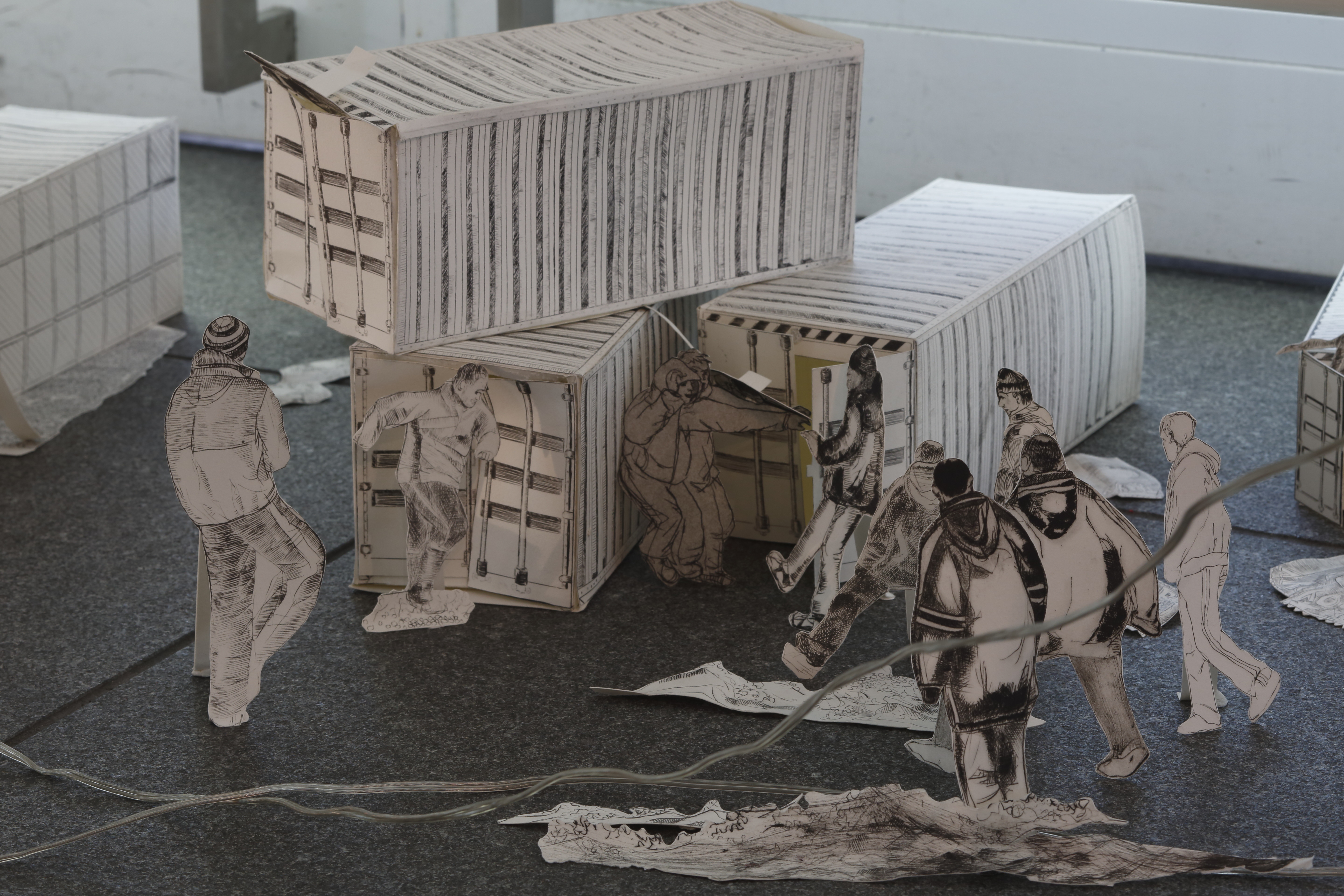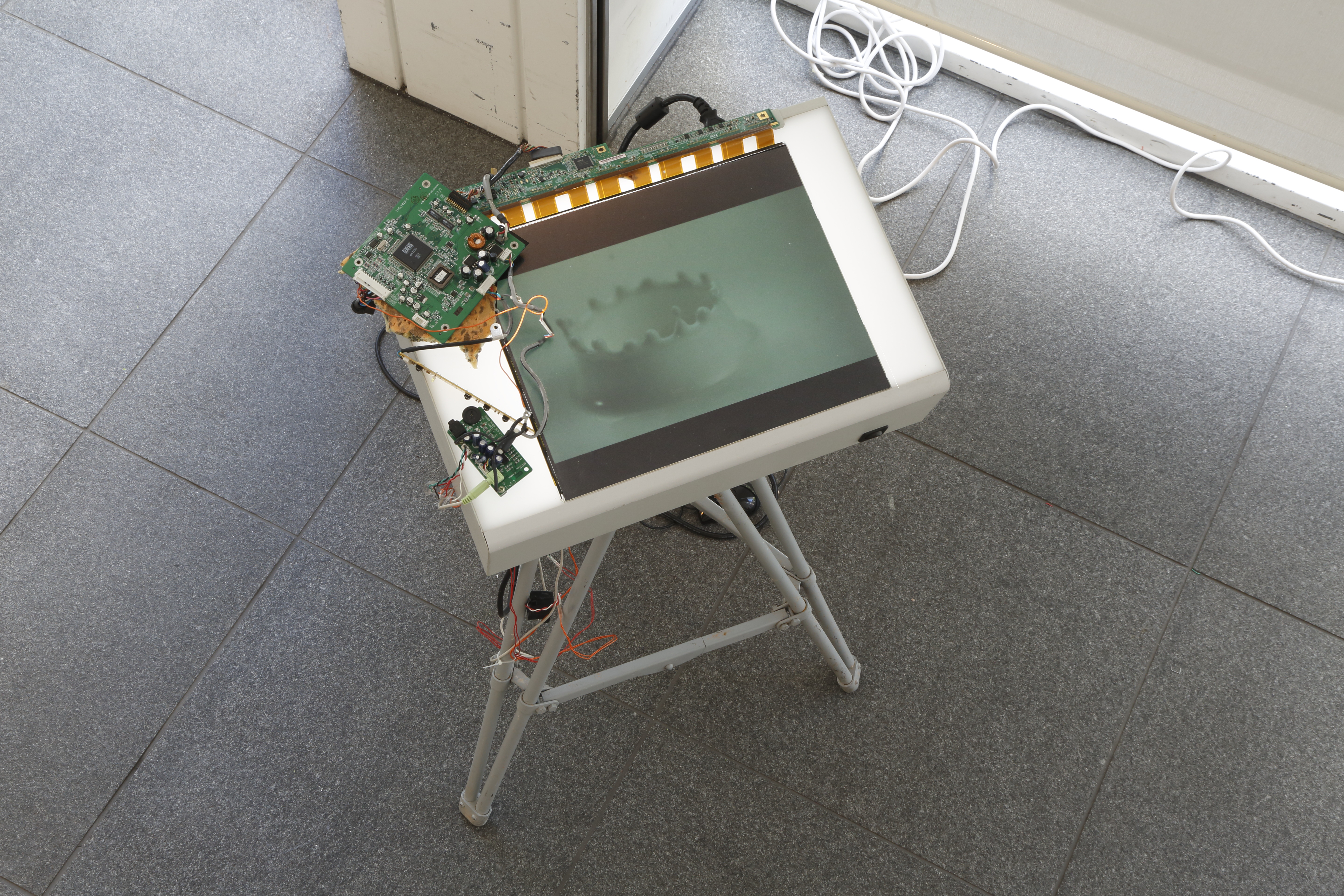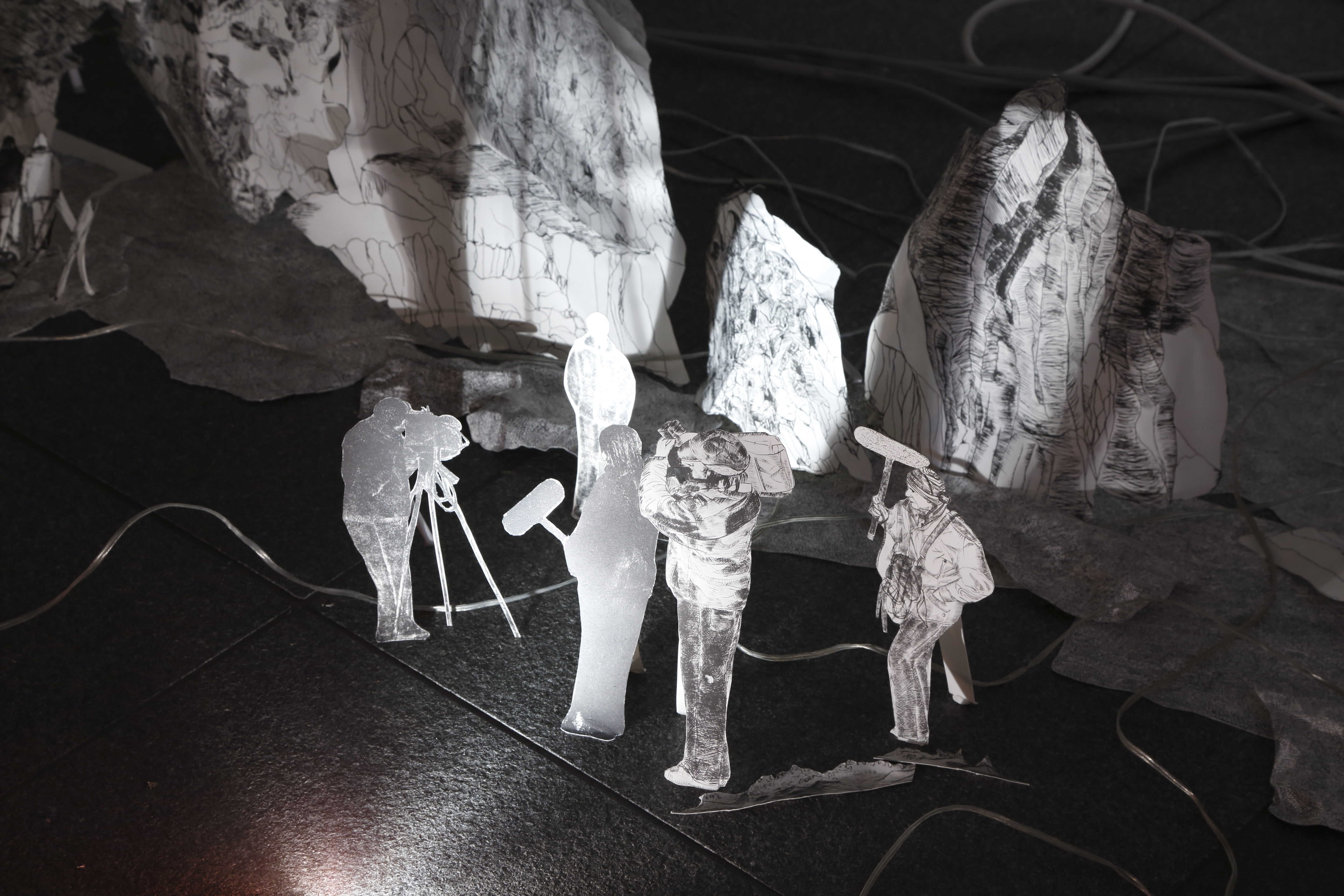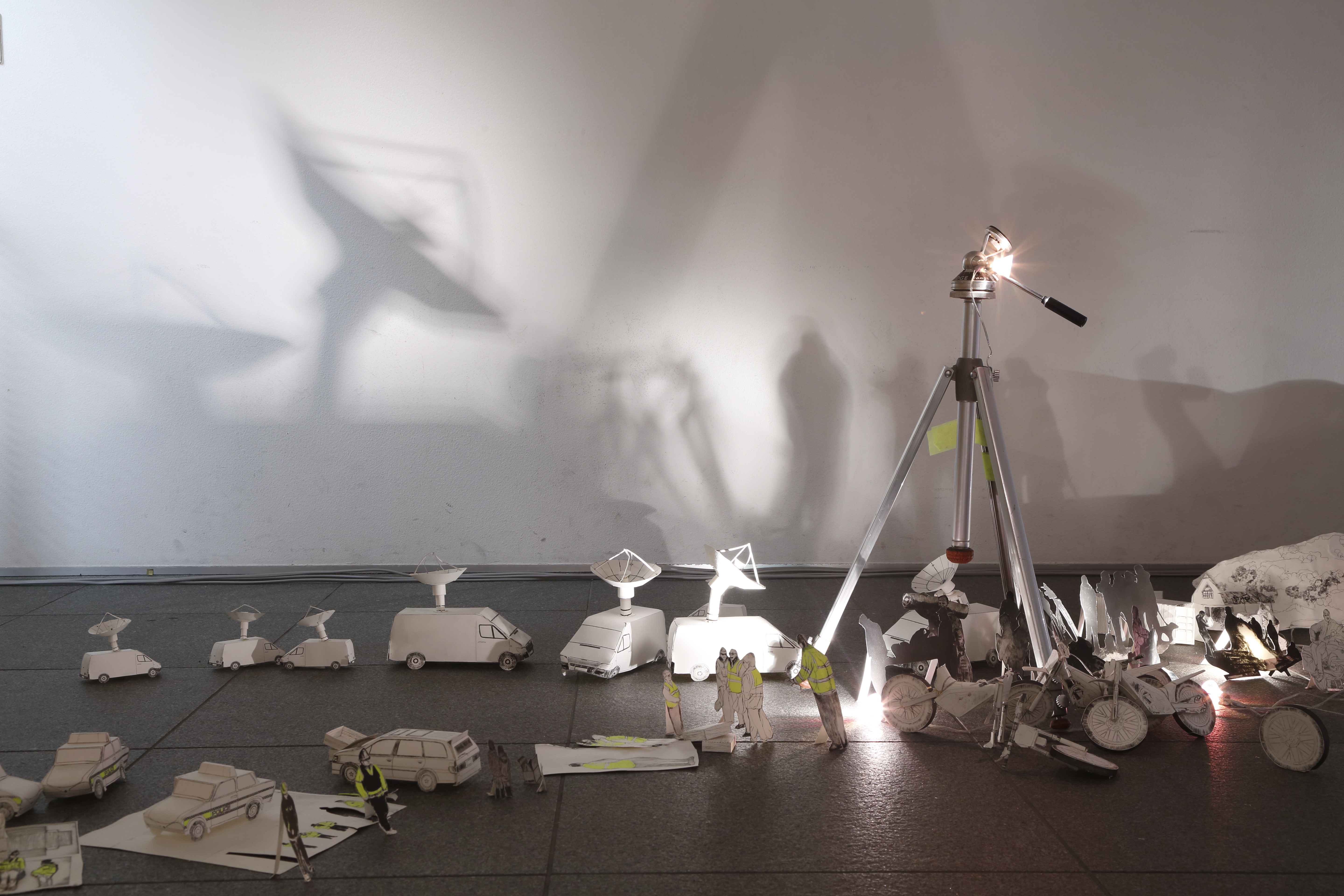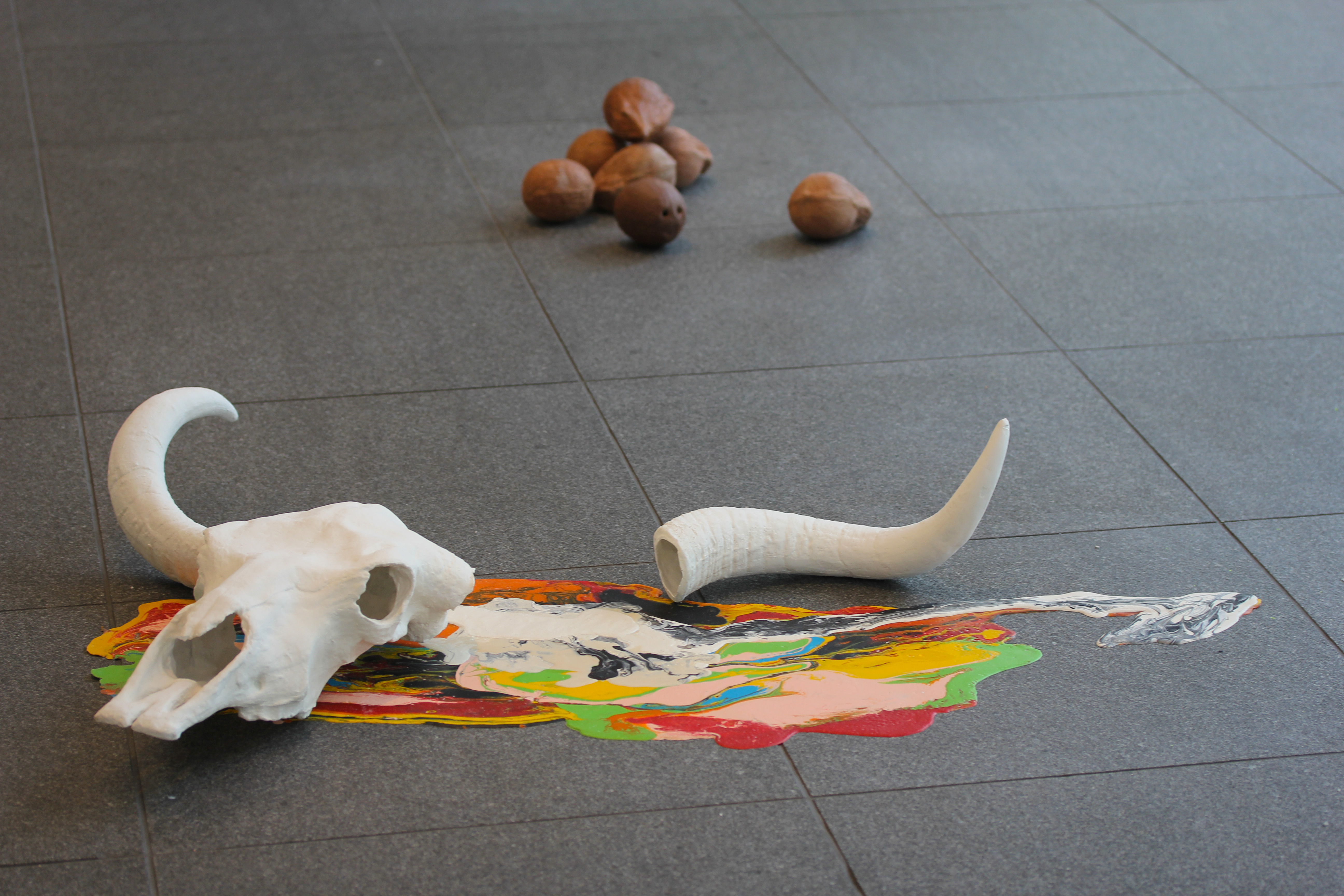 Melanie Jackson has developed a practice that allows her to reflect upon her own implication in larger social systems of circulation and exchange, and the prevailing narratives around everyday commodities that work to normalize our daily consumption of consumer products. Previously she has focused on globalization and popular attitudes towards the new mobility of goods and people, circulating around the world, whilst, in more recent times, her attention has shifted to the mythologies and processes of abstraction that we apply to natural products. Her approach is to try out different tactics of representation, often referencing stories in the media, employing many different techniques, such as drawing, print-making, paper-cutting, origami, sculpture, papier-maché, video, animation, performance, music, installation and other craft traditions, but always keeping her own complicity in the representation of her subject visible, as part of the circulation of meanings around her work. For the Dojima River Biennale, Jackson presented two site-specific installations. In the two-part work, The Undesirables, she referenced simultaneous events taking place in the summer of 2007 along the British coastline in which the subjects of the stories were deemed ‘undesirables’ by the UK authorities and the media. The first part of this installation was made up of a diorama of etchings reconstructing the wreck of the container ship MSC Napoli off the ‘Jurassic’ coast of South Devon, and the ensuing media frenzy as a bonanza of consumer goods were washed up on the shoreline – motorbikes, methyl bromide, flip flops, 3600 xhosa bibles, a tractor, face cream, perfume, etc. The unfettered pleasure of this free-for-all soon gave way to a narrative of contempt towards the public as they plundered and laid claim to the consumer goods that had become common property. In the second part of the installation, an animated video interview with nearby dockworkers documented the lengthy measures taken by the UK authorities to detect illegal immigrants coming into port in lorries and containers, like so much detritus washed up on the currents of global trade. Jackson’s second installation, The Land of the Eternal Infant (commissioned specifically for the Biennale), took the basic foodstuff of milk as its subject matter, incorporating a mixture of wax-clay sculptures of cows’ skulls and coconuts, multi-coloured porcelain and latex spills, a computer animation on a de-constructed screen and a tower of customized consumer products, reflecting on how this staple of everyday life has become a cipher of protracted infancy and postponed desire in contemporary culture. Milk is core to our early development, and socialization, as human beings, but it has also become the basis for a massive process of industrialization and mass-commercialization. As milk is abstracted away from the maternal body, it has been made the subject of numerous mythologies and fantastical associations throughout the course of history. In Japan, the popular milk-based soda drink, Calpis, weaves stories of fermented mare’s milk from the Mongol steppes and the Taranbata festival of the stars into it’s corporate history, with the polka dot design of its products based upon the constellations of the Milky Way. Meanwhile, in Second World War, the photographic documentation of milk droplets and their slow-motion splashes became the basis for the impact theory of bullet trajectories, and were even used to model the detonation of the atomic bomb. Thus, the artist observes, “that which is associated with the establishment of life is re-routed for the purposes of death”[1], abstracted from maternal care to annihilation.
