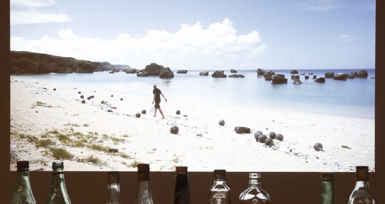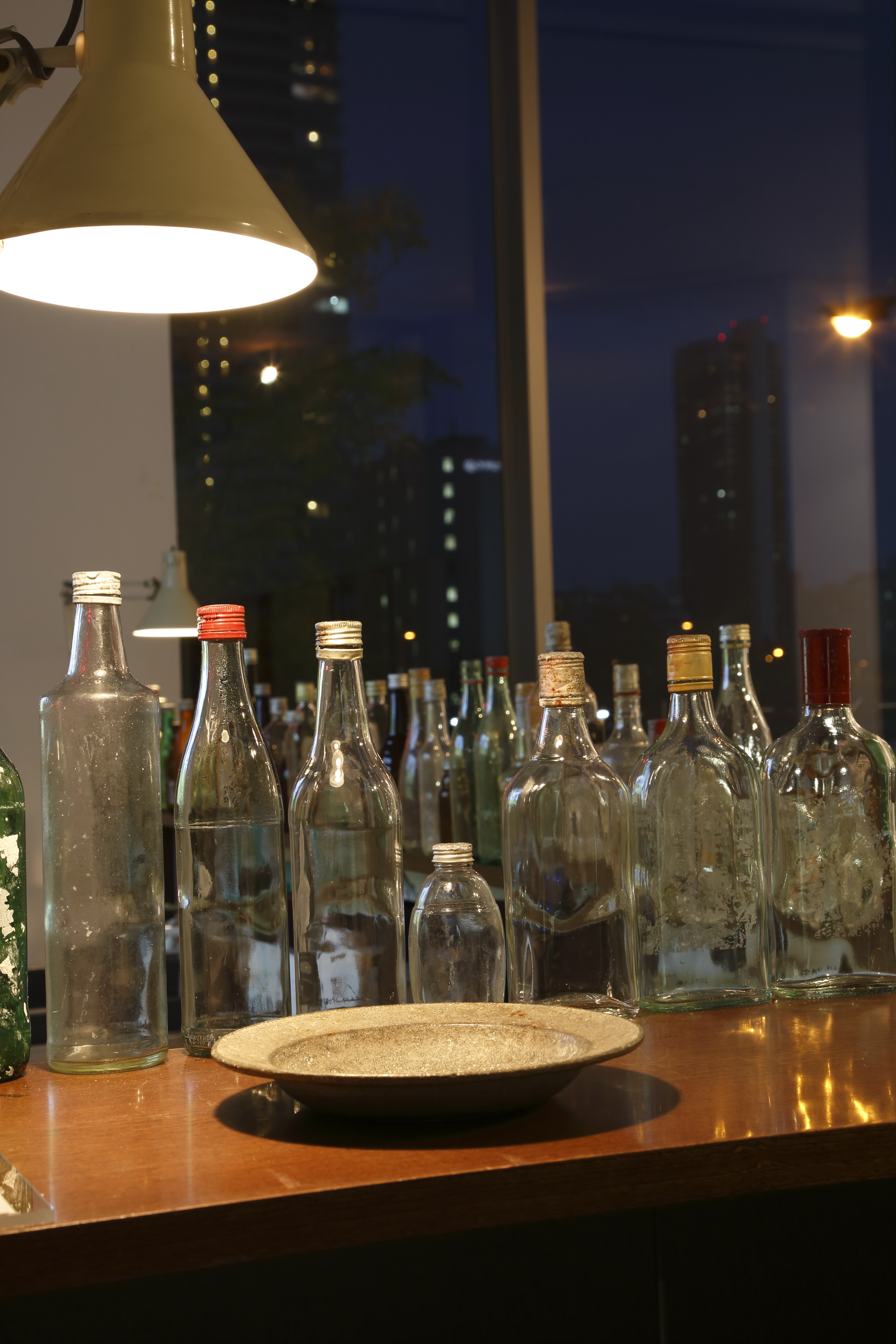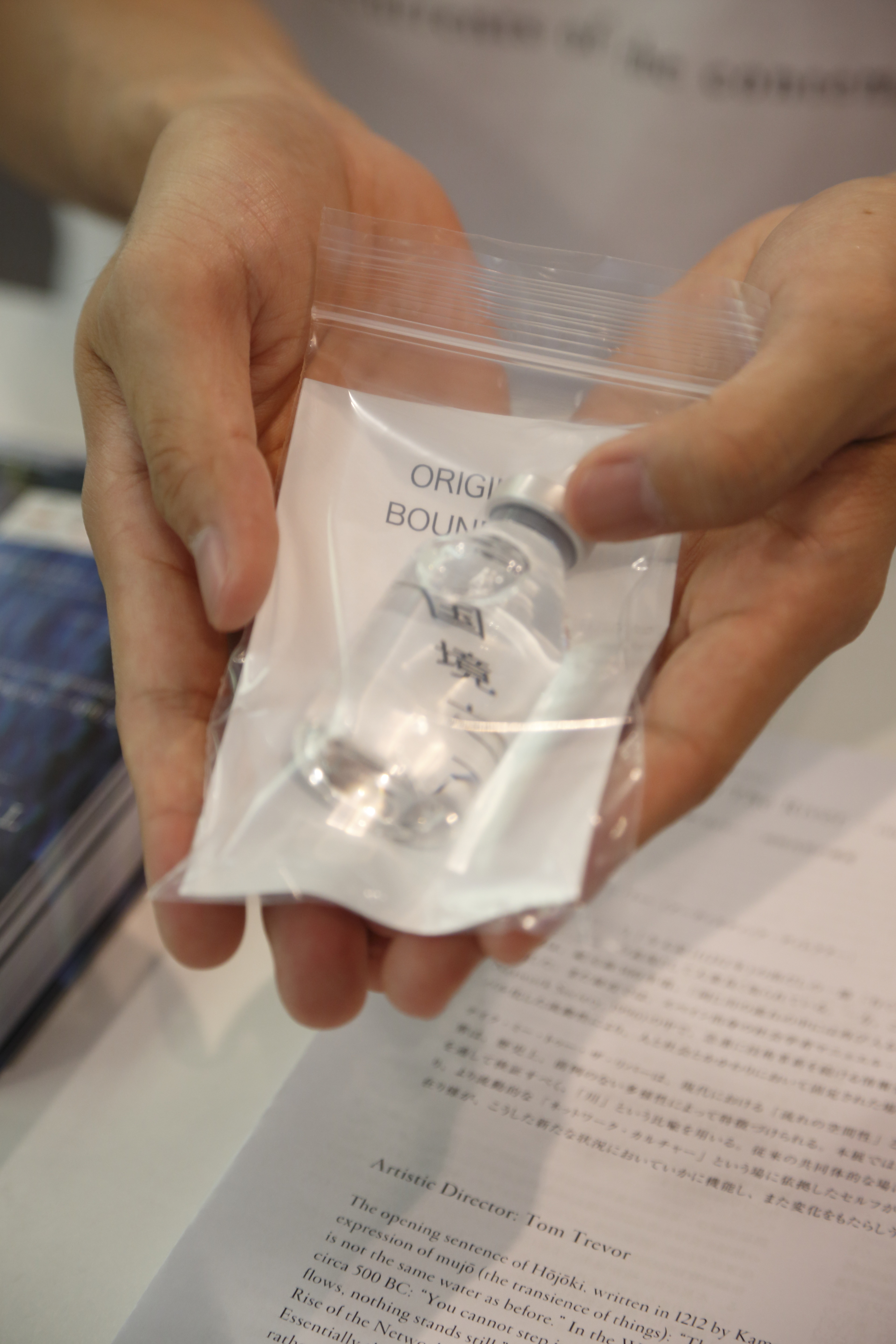Shitamichi Motoyuki (born 1978, Okayama, lives in Nagoya) is a ‘traveling’ artist, known for his interest in borders. In the course of his wanderings, drifting from place to place without a specific destination, he accumulates objects that he stumbles upon, often relating to symbolic sites of exchange, or he photographs examples of hidden border crossings, such as the derelict remains of torii (shrine gates), encountered in foreign lands once occupied by Japan, or the Remnants of wartime bunkers, scattered around the islands’ coastline. In the Bridge project, Motoyuki took photographs of everyday ad hoc structures, such as a plank of wood, a concrete slab or even an upturned skateboard, that people had improvised into bridges so as to cross day-to-day boundaries, such as a ditch or a gap in the footpath. For the Dojima River Biennale, he created a number of new projects in relation to the idea of borders, and transformation, under the umbrella title of Floating Monuments, exploring the concept of “drifting/staying”, and the notion that “things that look solid are in fact liquid”. For the work, Original Boundary, the artist used samples of seawater, scooped up from the disputed ocean border between Japan and Taiwan from the side of a fishing boat, which he then sold in the Biennale shop, in small bottles, as a limited edition of 100. He also presented an installation of new works made on the Japanese island of Okinawa (a major base for the US military, since WWII), entitled Okinawan Glasses, using glass bottles swept ashore from across the Pacific Ocean by the Kuroshio current, out of which he crafted a range of recycled Ryukyu glassware. Alongside this he placed a ‘duralumin’ plate, found in an Okinawan thrift store, made from the recycled metal of WWII fighter planes (still bearing the ‘Watertown’ stamp of the original US plate that was used to cast it). Behind this display of battered bottles, recycled metalware and beautifully flawed glasses, arranged along the counter of a shiny bar, Motoyuki projected a video, Tsunami Rocks, showing the artist gathering up these washed-up bottles from the beaches of Okinawa, whilst wandering amongst the giant boulders deposited on the island during a tsunami that took place 240 years earlier. Motoyuki’s poetics of ‘drift’ problematizes our assumptions about borderlines, values and exchange. How do you find a value for a particular sample of seawater, from a particular place, that challenges its generality as just ‘seawater’? Is the water more valuable because it derives from the disputed borderline between two rival nations? Or because it has been presented for our attention by an artist? In the imaginary process of valuation, what does it mean to attach the flotsam and jetsam of time to particular narratives of history in order to invest them with significance?