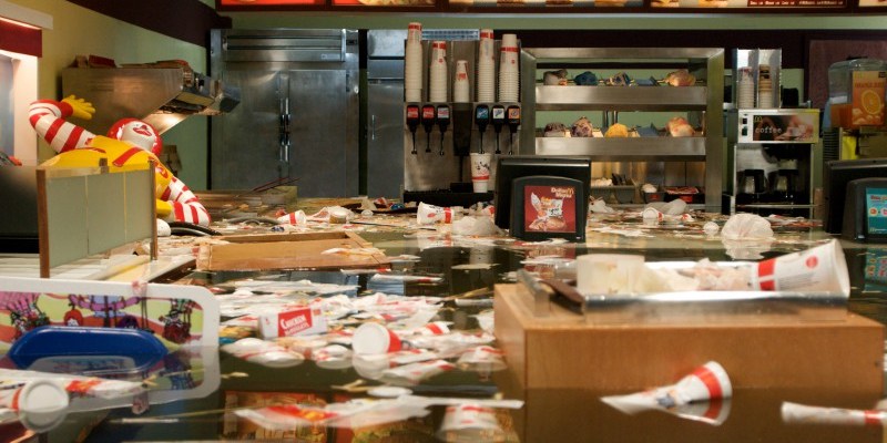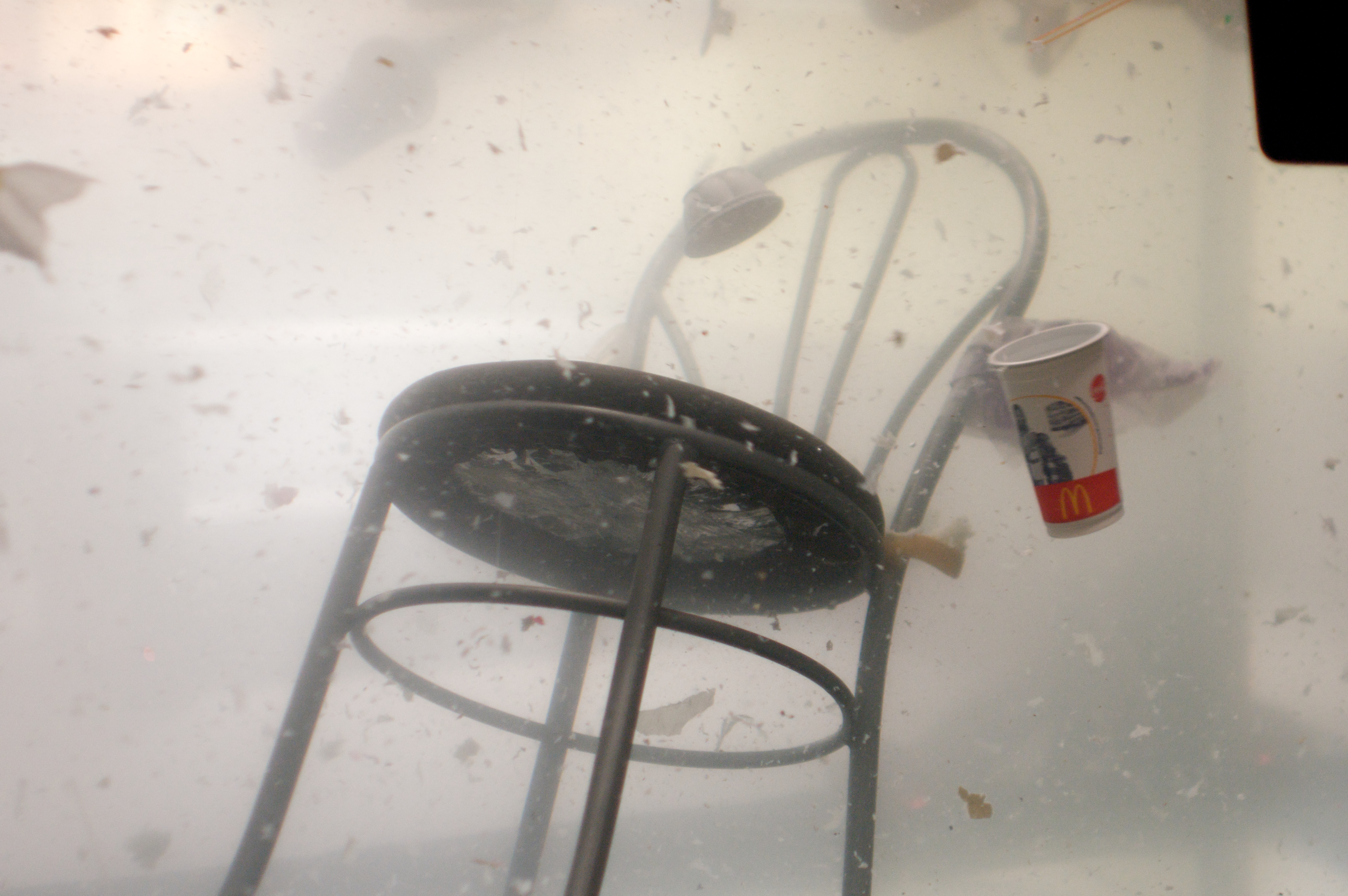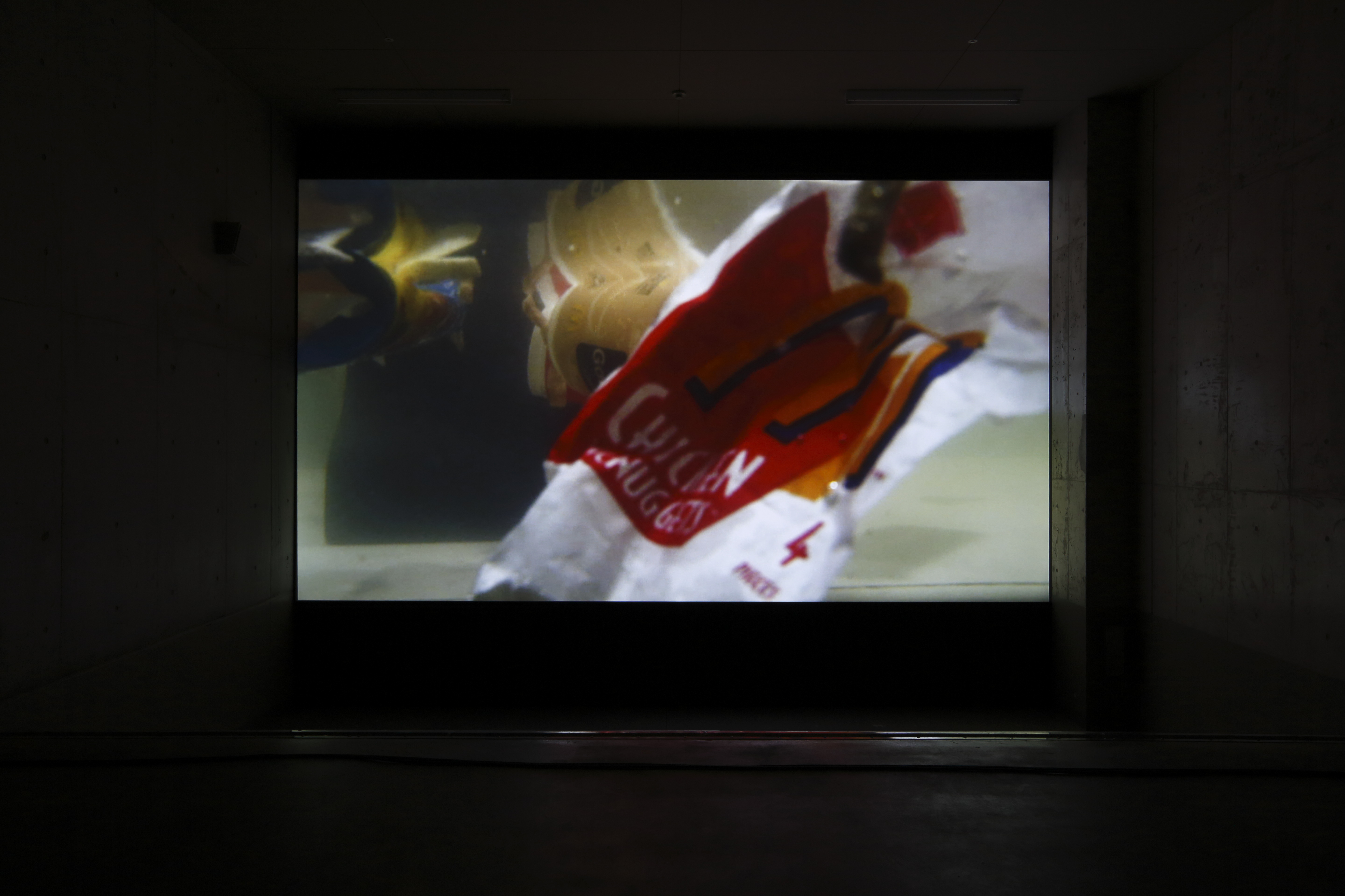 SUPERFLEX is an artists’ group founded in 1993, in Copenhagen, by Bjørnstjerne Reuter Christiansen (1969), Jakob Fenger (1968) and Rasmus Nielsen (1969). They describe their projects as ‘Tools’, that work as proposals for social change, inviting people to participate in the development of experimental models that alter the conditions of economic production, and the impact upon the environment. Often their projects are related to alternative economic systems, democratic processes of self-organization and linked to their avowed interest in political and social engagement on a local scale. They do not place themselves in opposition to existing systems, but unpick the political, economic and communication strategies that have been put in place in a particular social context in order to make them more visible. Thus SUPERFLEX intervenes in places where it appears necessary to implement a ‘counter-economic’ solution by experimenting with means of alternative production. They conceive of their projects in response to a specific context, whether it is that of an artistic institution or a social situation and create works that often establish a link between these two realities. They also make a distinction between two types of projects with different temporalities: works that occur during an exhibition and others that evolve over several years. Thus, since 1997, they have been working on a biogas system (SUPERGAS), first installed in Kenya, then Thailand and today in Mexico, perfecting at each stage the means of production, utilization and commercialization of this system. The project, GUARANA POWER, in which the artists developed a drink, together with a local farmers’ cooperative from Maués in the Brazilian Amazon who cultivate the caffeine-rich berries of the guarana plant, is one of these sustainable projects that create a real financial economy. These artistic activities are not necessarily opposed to commercialism and globalization, but try instead to render economic structures visible and to establish a new balance. For the Dojima River Biennale, SUPERFLEX presented a site-specific installation of their video-work, Flooded McDonald’s (2009), a 21-minute film in which a convincing life-size replica of the interior of a McDonald’s burger bar, without any customers or staff present, gradually floods with water. Furniture is seen being lifted up by the rising waters, trays of food and drinks start to float around, electrics short circuit and eventually the space becomes completely submerged. Flooded McDonald’s was originally produced in Ho Chi Minh City in collaboration with the Propeller Group (and in association with Matching Studio, of Bangkok), with all of the props made specifically for the film. In the context of Take Me To The River, the video was installed within the loading bay of the Forum, a utilitarian concrete space designed for lorries to reverse directly into the backstage area of the building from the street outside, separated from the nearby waters of the Dojima River, and the commercial heart of the city of Osaka, by a thin metal shutter.