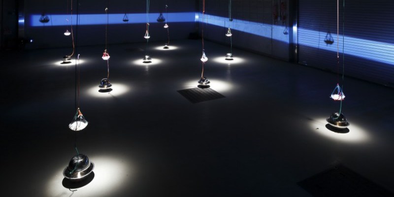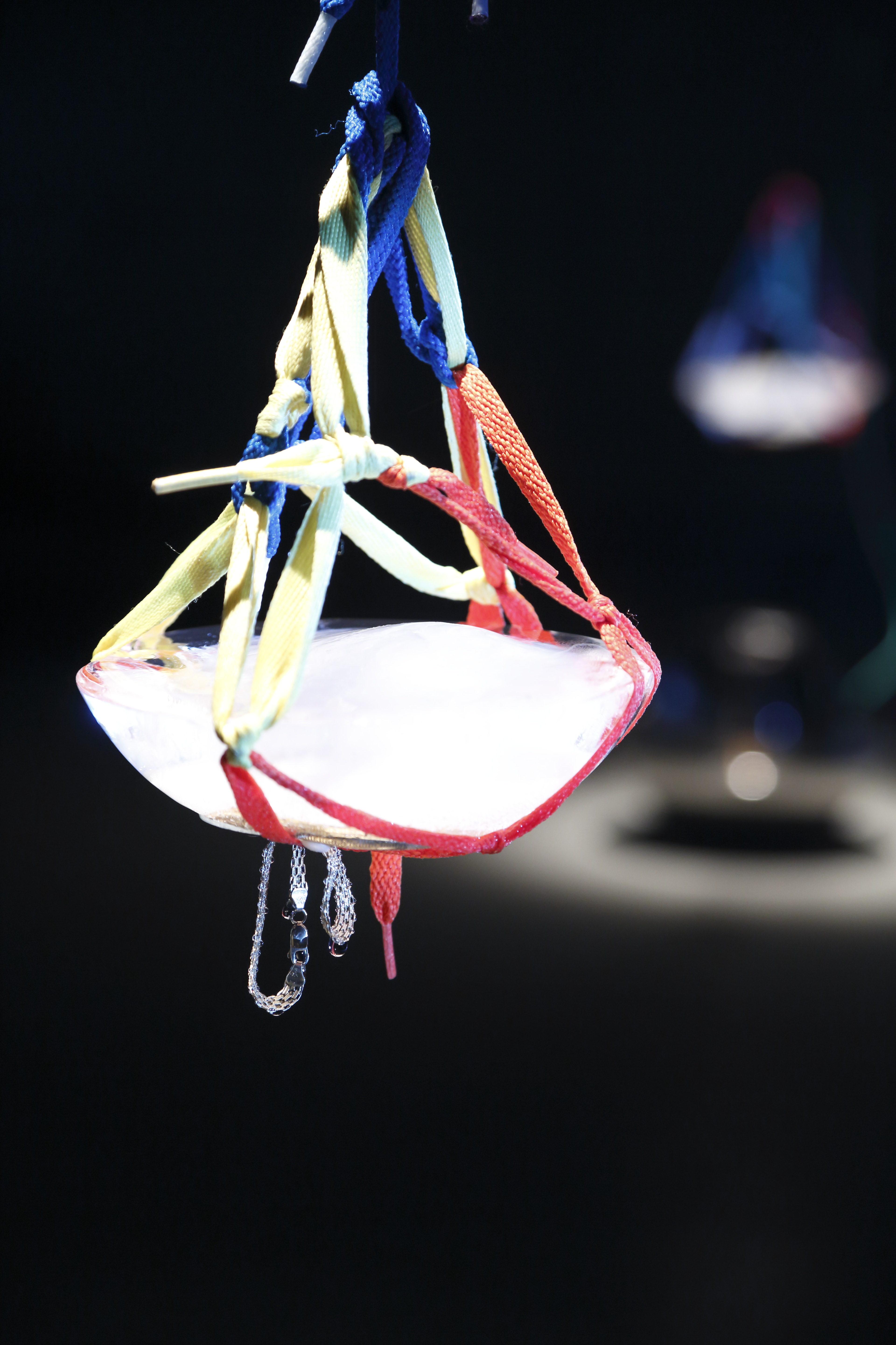 Aki Sasamoto’s installations and performances explore the underlying strangeness and nuances of everyday life. She uses sculpture, movement, video, and sound to transform mundane actions into theatrical events. As an integral part of her practice she often collaborates with others, including artists, musicians, choreographers, mathematicians and scholars, and she co-founded Culture Push, a New York-based non-profit arts organization, to enable diverse professionals to meet through artist-led projects and cross-disciplinary symposia. Her performance works revolve around everyday gestures. She has described these carefully prepared improvisations as an escape from “thiis world (the everyday, banal relationships, and talking)” into “thaat world (productions, improvisation, and introspective thinking)”,[1] like being transported into a parallel universe. “I use judgments, generalizations, and fictions, all crafted as close as possible to my experiences, to draw out personalized opinions and theories on nothing and everything. I want to create something that seems borderline real or general but simultaneously completely introverted and sealed up in my dreams.”[2] Her installations are similarly dream-like, and theatrical, using careful arrangements of sculpturally altered found objects from everyday life. The constructed stories seem personal at first, yet oddly resistant and alien, open to variable degrees of access, empathy and reflection. For Take Me To The River, she created a new site-specific sound installation in the basement storage area of the Forum, as development on from her Centrifugal series of works, entitled Talking in Circles in Talking, using ice, found objects and personal memorabilia. Eight round blocks of ice, of different sizes, were suspended from the ceiling by strings of multi-coloured shoe laces, knotted together. As each block gradually melted, drops of water dripped onto an up-turned stainless steel bowl, sitting on top of another larger bowl, with a pick-up inside, so that the sound was amplified through the space, treated with a delay which gave it a strange echoing resonance. Contained within each block of ice was a different set of personal mementos; bracelets, rings, spectacles, house keys, wrist watches, even a couple of CDs; each item what one might term a’ keepsake’, evoking memories of a particular person, or event, with whom the object is associated. Yet we do not know the person, or event, and so our urge for empathy is suspended. The personal meaning, embodied in the object, remains obscure. As time ticked away, marked by the treated repetitions of the dripping ice, these anonymous memorabilia gradually emerged from their frozen preserves, dangling awkwardly for a while until finally released, with a violent crash, onto the amplified bowl below. As the drama slowly unfolded, in the theatrically lit intensity of the basement storage area, the sound was simultaneously transmitted upstairs, into the covered public walkway outside the Forum entrance, providing a sparse, eery soundtrack of echoing drips to accompany the steady flow of pedestrians going about their daily routines.