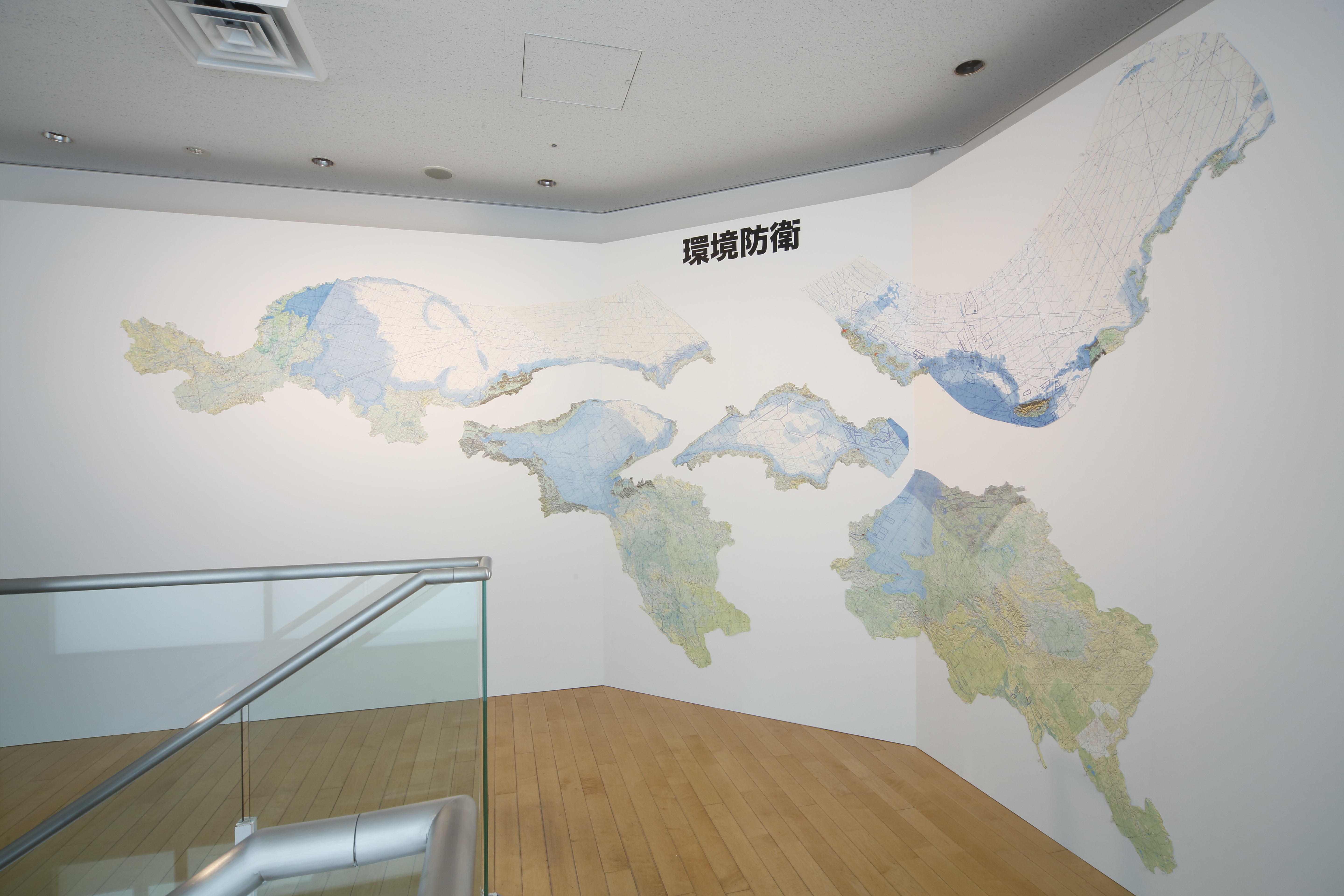 Peter Fend established Ocean Earth Development Corporation in 1980, emerging from the New York-based Offices (founded with Jenny Holzer, Peter Nadin, Richard Prince and Robin Winters). Operating as a flexible collective of artists, architects and engineers, Ocean Earth was specifically conceived as an instrument for implementing the goals of the environmental art movement, building upon the ideas of ‘land artists’ such as Robert Smithson, Michael Heiser, Dennis Oppenheim and Gordon Matta-Clark (with whom Fend worked closely until his death in 1978). One of Fend’s principle strategies has been to view global ecologies as centred around ocean basins, rather than land masses (rendering the terrestrial focus of human cartography peripheral to hydrometric geographies). At issue is what changes in the world’s circulatory patterns result from human actions, e.g. carbon emissions, deforestation, changes in river run-off, river dams, phytoplankton depletion in ocean waters, monoculture, desertification, etc. To deal with this human impact, Fend zeroes in on smaller regions, always defined as ocean or saltwater basins, and works to assess the environmental health of these sea areas, and thus propose sustainable solutions. For Take Me To The River, in his Ecological Self-Defence project, he focused on the sea areas bordered by the territories of Japan but also by the lands of China, Korea, Russia, Taiwan and the USA, and connecting ocean currents such as the Kuroshio, the Liman, the Tsushima and the Oyashio. Adopting Prime Minister Abe’s contentious reference to ‘self-defence’, Fend demonstrated the direct ocean-borne impacts on Japan, as part of a larger ecosystem, under attack from environmental pollution, the depletion of marine resources and global warming. In Japan Local Waters, he honed in specifically on the ‘bay basins’ of the Japanese archipelago, effectively proposing a re-organization of territorial boundaries around the rivers and watersheds of the islands, referred to as “Ecological-Depletion Taxation Districts”. This political reorganization also suggests a new way of understanding local relations to renewable energy production, as part of a process of replacing fossil fuels with sustainable energy resources such as hydro-electric power produced by waterwheels and wave energy and through the capture of solar energy by plants, especially saltwater algae (which Fend views as the source of the “new petroleum”).