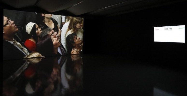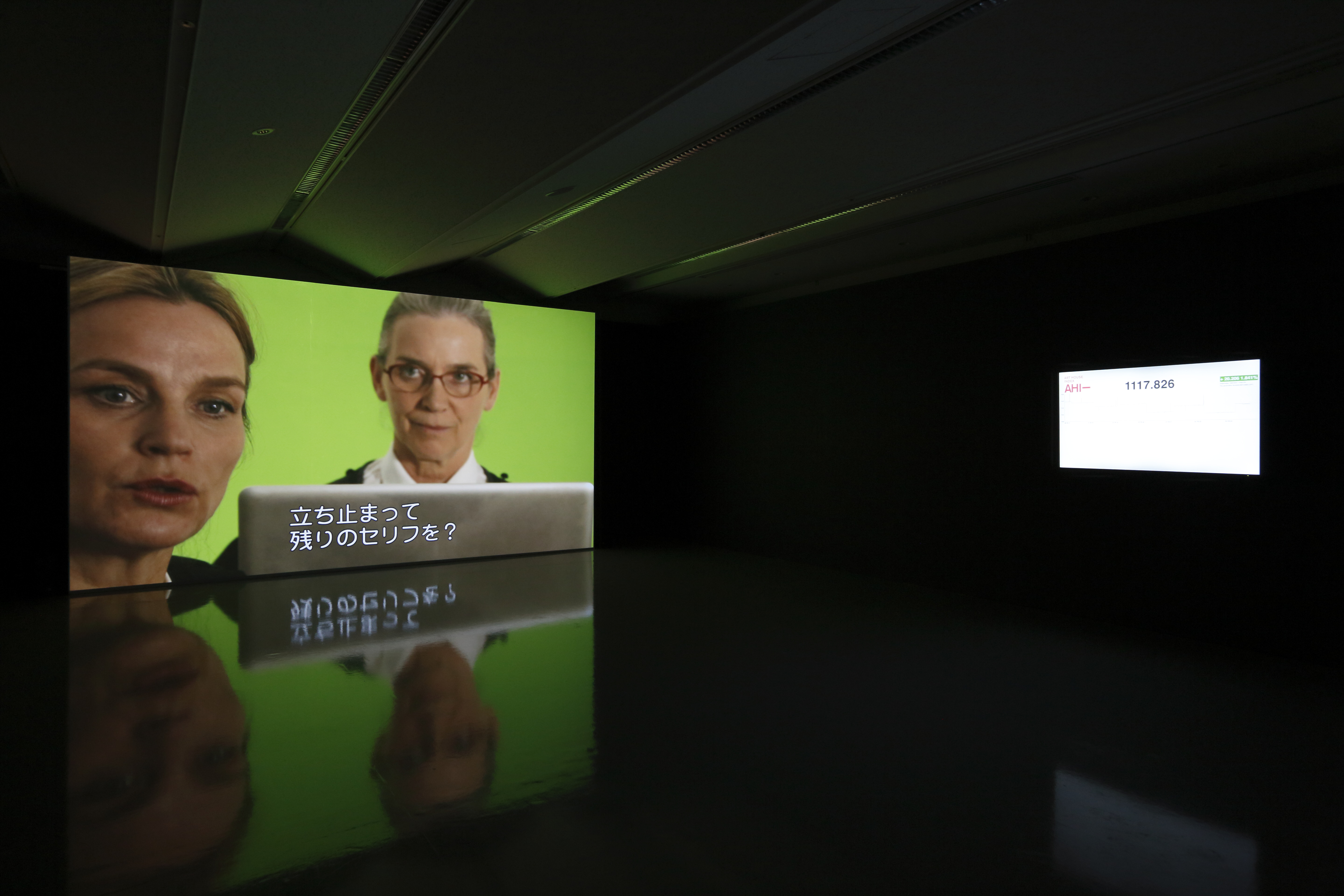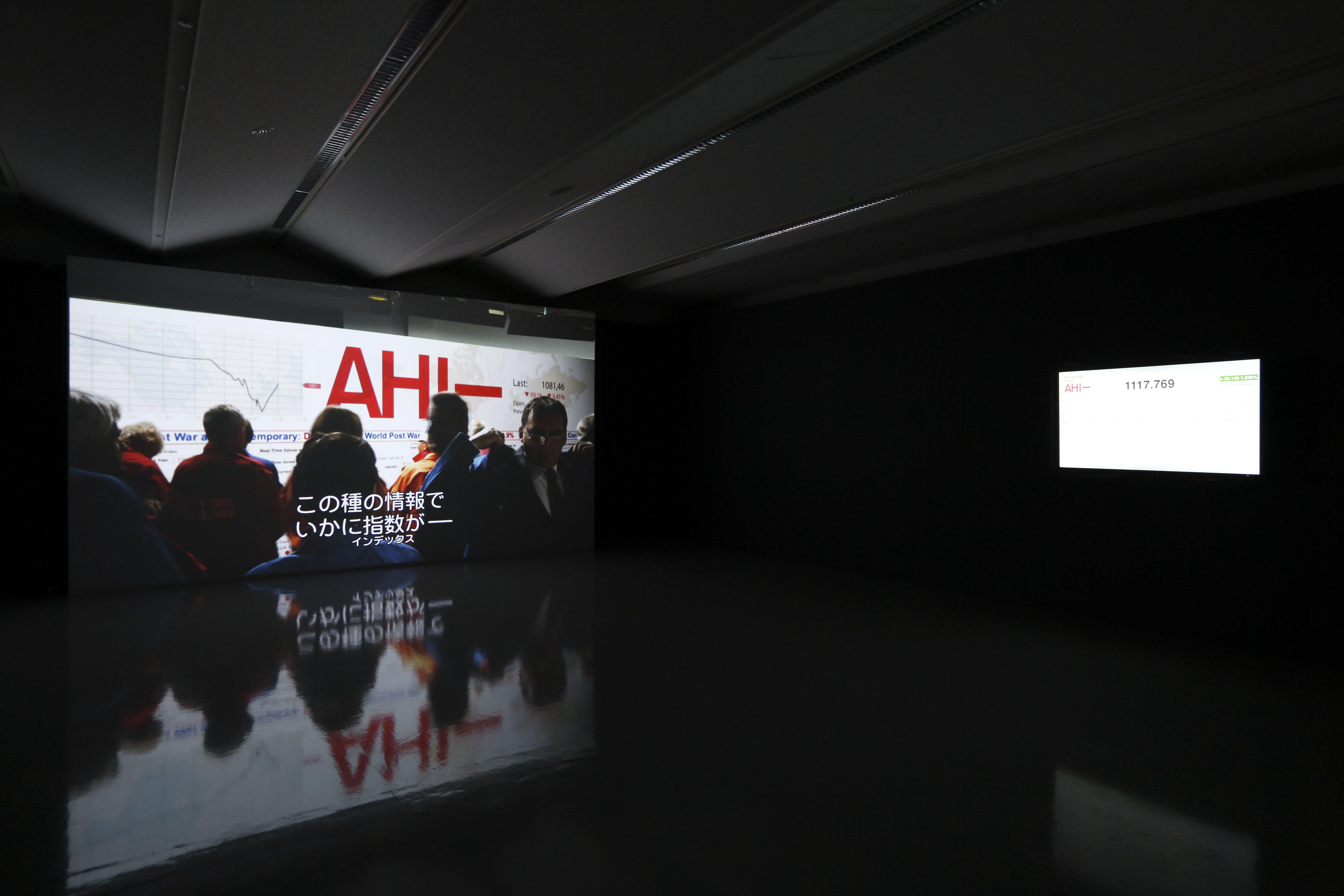 Artist duo, Katleen Vermeir and Ronny Heiremans, focus on the dynamics between art, architecture and economy, applying a reflexive logic to their own relationship to these wider systems of belief and valuation that result in deeply ironic critiques of contemporary living. In their collaborative practice they have a single artwork, their own home, a loft apartment that they constructed within a post-industrial building in Brussels. Whilst keeping this private, they use the idea of their own personal domain as an artwork from which they create “mediated extensions”[1], translating their domestic space into installations, videos, performances and publications, that generate a public interface with their private residence. ART HOUSE INDEX (AHI–) is a new ‘extension’ that proposes the transformation of ‘the home as an artwork’ into a financial instrument. The function of this index is to measure the fluctuating market value of their home-as-artwork, thus rendering a normally un-trade-able private space into a transparent, virtual and ‘liquid’ investment that is theoretically accessible for financial speculators. The accompanying video A Frontier Investment Opportunity acts as a kind of quasi-promotional sales pitch, panning across the interior of the artist’s home, but with views through the windows to all of the different cities around the world where public extensions have been exhibited. In their new video installation co-commissioned by the Dojima River Biennale, MASQUERADE, a TV-reporter is seen commentating on the AHI– ‘s Initial Public Offering, as the abstract concept of their home-as-artwork is floated on the market. The film is set in a fragmented environment that gradually evolves from a gallery ‘white cube’ to an auction house, a commodity exchange, a trading pit, even a courtroom… all places where values are negotiated and exchanged. But then it starts to go wrong! Questions arise: are we witnessing an insider-trading scandal in an auction house, a crash in the market or is this a hearing in a courtroom that tries to unveil the intricate dynamics of a confidence game? Alongside the main projection of this fragmented narrative, a real-time algorithm is presented on a smaller screen, monitoring the fluctuating value of AHI- live, measuring the confidence and belief of the market in the artist’s home-as-artwork. It becomes apparent that the actual performance of the AHI-, as it rises and falls in value, determines which images of MASQUERADE will be projected on the main screen, triggering a switch between two video timelines, one of which shows the ‘finished’ film while the other captures variations, rehearsals and failures. Alongside, Vermeir & Heiremans also presented a new edition of their faux lifestyle magazine, In-Residence Magazine # 02, a glossy coffee table periodical offering background information on the concept of ‘value’ in the worlds of finance and contemporary art. Art, like finance, is a system of belief and their different markets are where this belief is put to work. The ephemeral worlds of “high finance” and the “global art markets” thus offer a unique context for the narrative of MASQUERADE. Likewise, the Dojima River Forum provided a unique location for such a conceptual proposition, situated as it is virtually on the site of the original Dojima Rice Exchange, established in 1697, which is often cited as “the first ever futures market and, as such, the forerunner of the modern banking system today.”[2]